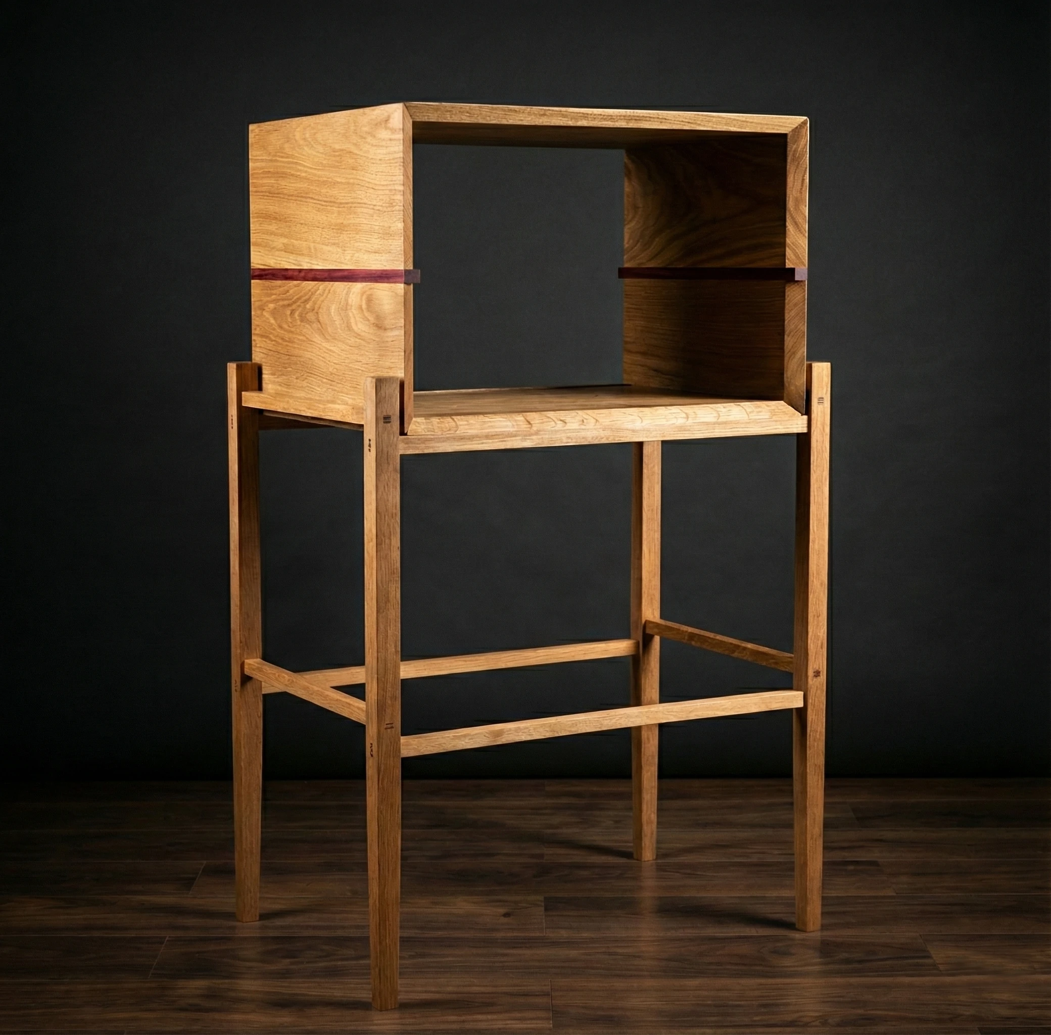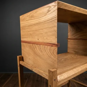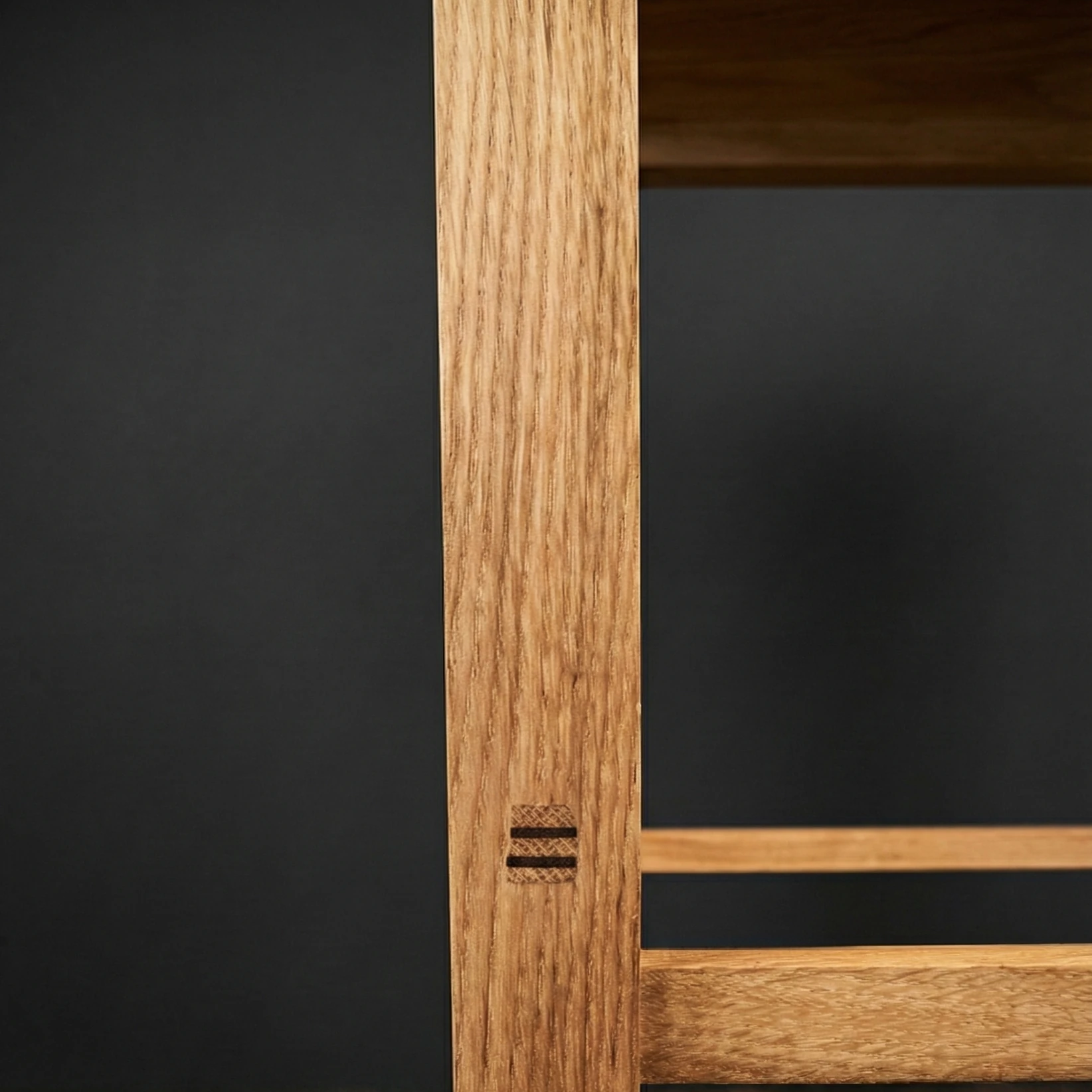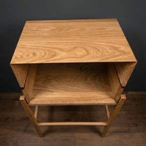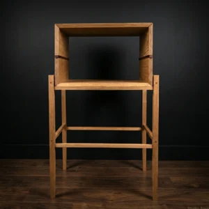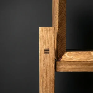 Constructie: Gemaakt van massief eikenhout. De pen-en-gatverbindingen zijn niet weggewerkt, maar vormen juist een trots detail van het ontwerp. Ze garanderen een constructie die generaties lang meegaat.