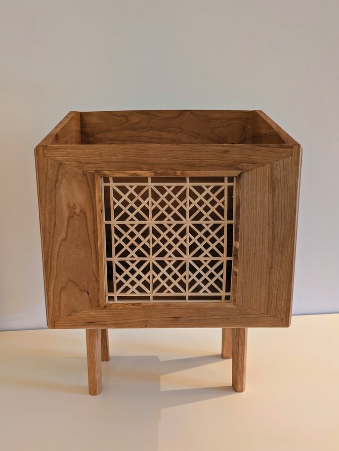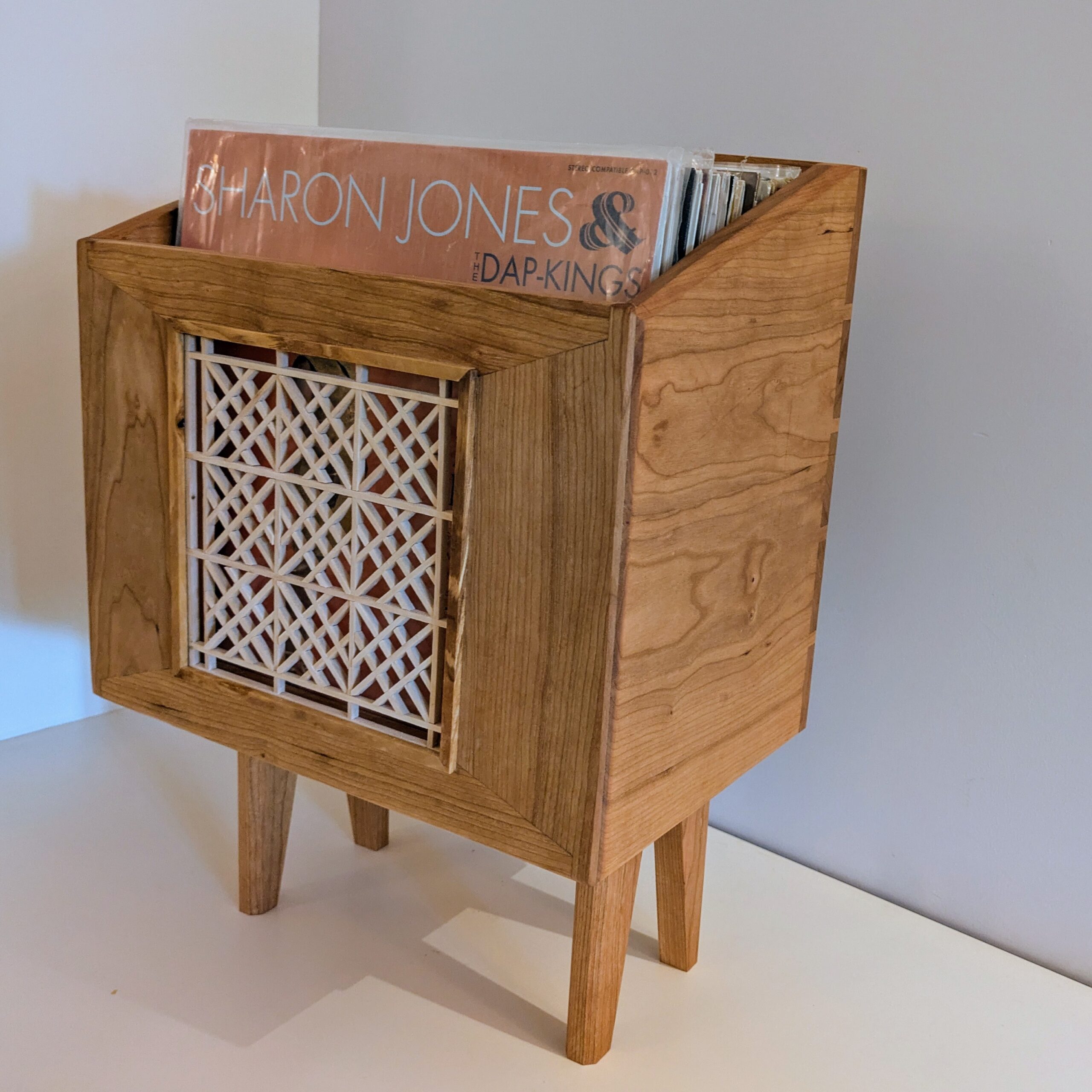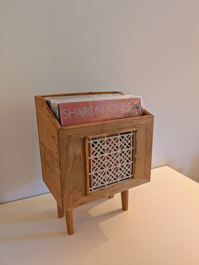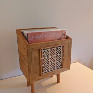 Deze handgemaakte platenkist is een eerbetoon aan zowel uw muziekcollectie als aan het traditionele houtbewerkingsambacht. Door massief kersenhout te combineren met een verfijnd Kumiko-paneel ontstaat een uniek opbergmeubel dat met de jaren alleen maar aan karakter wint. Elke kist wordt door mij persoonlijk vervaardigd in de studio, waarbij de natuurlijke tekening van het hout en de precisie van de Japanse vlechttechniek centraal staan. Er is in dit ontwerp ruimte voor ongeveer 40 tot 50 elpees, waardoor uw favoriete albums de plek krijgen die ze verdienen.
